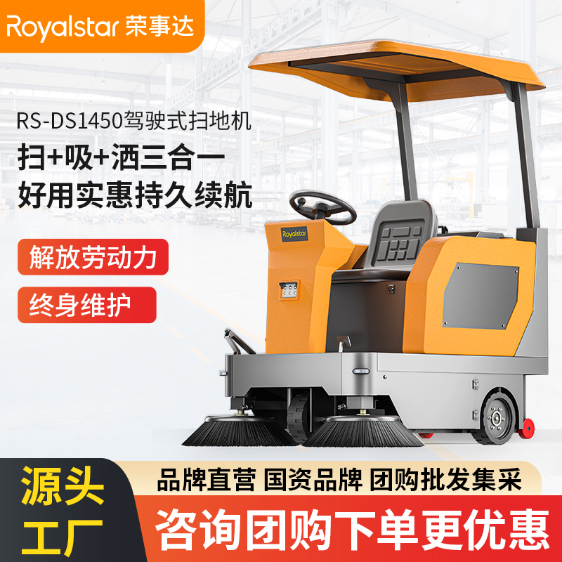 榮事達DS1450駕駛式掃地機,掃灑吸一體機,一遍干凈輕松省力,180L塵箱容量告別多次傾倒,噴霧抑塵有效控制揚塵,...